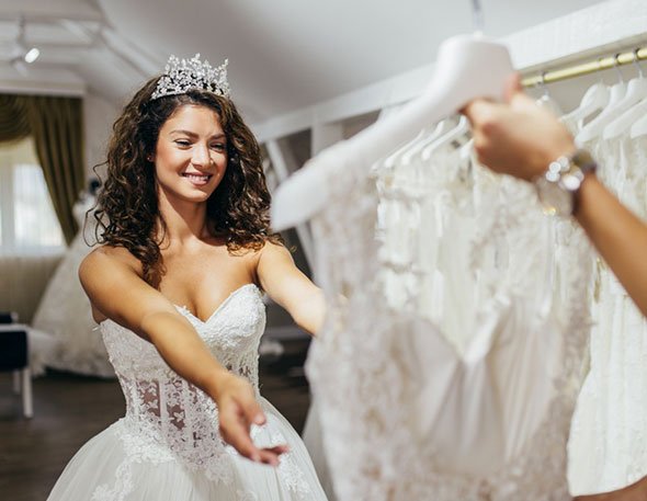 Working with a knowledgeable bridal consultant, a customer can enjoy trying on a wide selection of gowns and dresses in her size